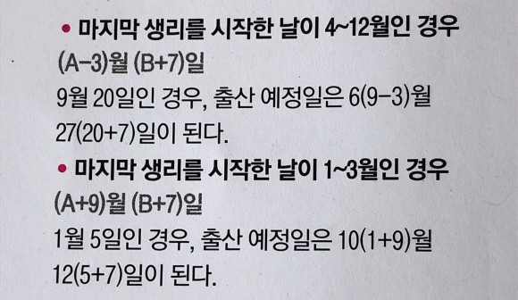 마지 막 생리 를 시작한 날짜 에 7을 더하면 출산 예정 일을 알수있어요