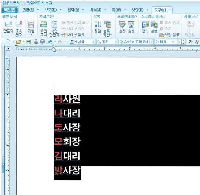 먼저 한글문서에서 예시 하나를 준비했는데요 정렬순서를 살펴보시면 앞에 자음 배열 순서가 랜덤으로 배열되어 있습니다 이 순서를 한글 가나다순 정렬 로 배치해 보겠습니다 우선 정렬해주실 글자를 마우스를 이용해서 모두 드래그 해주세요