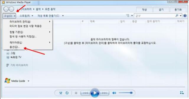 가장 먼저 다음과 같이 윈도우내 기본적으로 설치되어 있는 윈도우 미디어플레이어를 실행해 주셔야 하는데요 위와 같이 실행해주셨다면 상단 메뉴 항목에서 [구성] -> [옵션] 항목을 클릭해줍니다