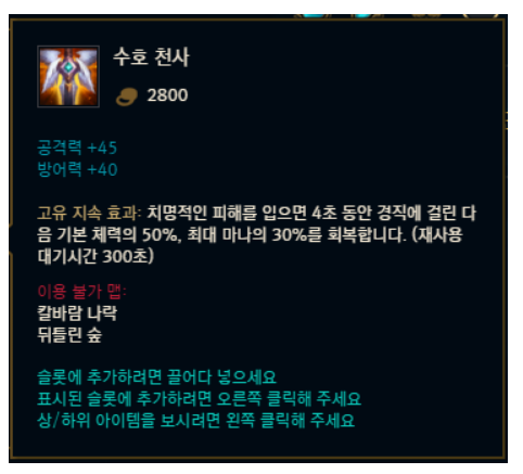 마지막 5코어는 수호천사를 사용해주시면 됩니다. 만약 상대팀에 탱커가 많다면 루난 대신 몰락한 왕의 검을 사용해서 들어오는 적에게 액티브 스킬을 사용해주고, 평타로 최대 생명력의 8%에 해당하는 물리 데미지를 더 넣어주시는게 좋습니다.