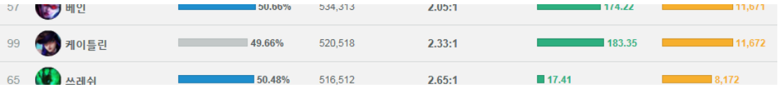 특히 패시브인 해드샷 효과를 잘 이용하면 생각보다 강력한 딜로 상대를 당황하게 만들기도 하며, 부쉬에서 중요 오브젝트를 더 수월하게 취득을 하기도 하는 편인데요. 다양한 장점과 시원시원한 평타딜을 보유하고 있고, 궁극기도 딸피의 적을 확정적으로 맞출 수 있어 인기가 매우 좋은 편입니다. 하지만 최근 승률을 보면 50%를 넘지 못하며 꽤 낮은 모습을 보여주고 있습니다. 잘만 사용하면 충분히 좋은 챔피언이라고 생각이 되기 때문에 본 공략을 참고해서 연습을 해보시면 좋겠습니다.