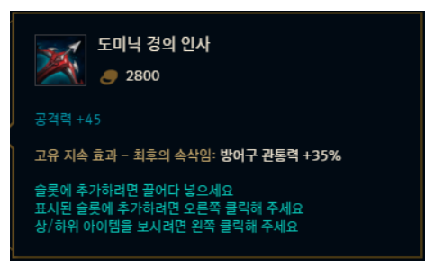 4코어는 도미닉 경의 인사를 사용해주시면 되는데, 만약 상대팀에 문도나 블라디와 같은 회복을 하는 챔피언이 있다면 필멸자를 사용해주시면 됩니다.