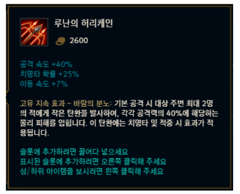 3코어는 루난의 허리케인을 사용해주시면 됩니다. 한타에서 생각보다 더 많을 딜을 넣을수 있도록 해줍니다.