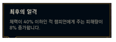 마지막으로 최후의 일격을 사용해주세요. 은근 궁극기를 맞췄을 때 딸피로 살아남는 경우가 많기 때문에 최후의 일격으로 피해량을 8% 올려주는게 꽤 도움이 되는 편입니다.