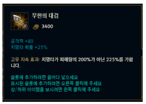 마지막으로 롤 시즌9 케이틀린 템트리 공략을 알아보겠습니다. 먼저 1코어는 무한의 대검을 올려주시는게 좋습니다. 첫 귀환에서 BF대검을 살 수 있으면 가장 좋고, 골드가 부족하다면 곡괭이와 신발을 사주시면 됩니다. 치명하 확률을 비롯해 치명타 피해량을 올려주기 때문에 케이틀린과의 시너지가 매우 좋은 편입니다.