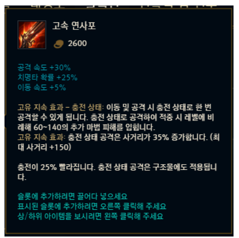 2코어는 고속 연사포를 사용해주시는걸 추천합니다. 사거리가 길어지고, 기민한 발놀림과의 시너지도 좋은 편이기 때문인데요. 하위템은 열정의 검을 먼저 올려주시면 됩니다. 만약 상대팀의 CC기가 많고, 까다로운 편이라면 2코어 이후에 수은을 하나 올려주시면 됩니다. 수은은 5코어로 헤르메스까지 올려주시면 됩니다.
