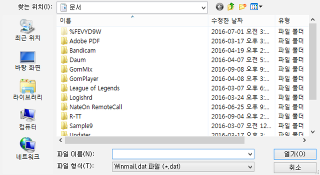 그리고 열기 창에서 열기를 원하시는 winmail.dat 파일을 선택해주시고 열기 버튼을 눌러줍니다