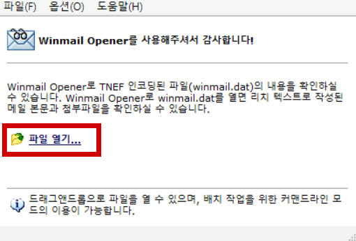 설치한 winmail opener 실행후 확인해보시면 중간에 보이는 파일 열기 버튼을 눌러주세요