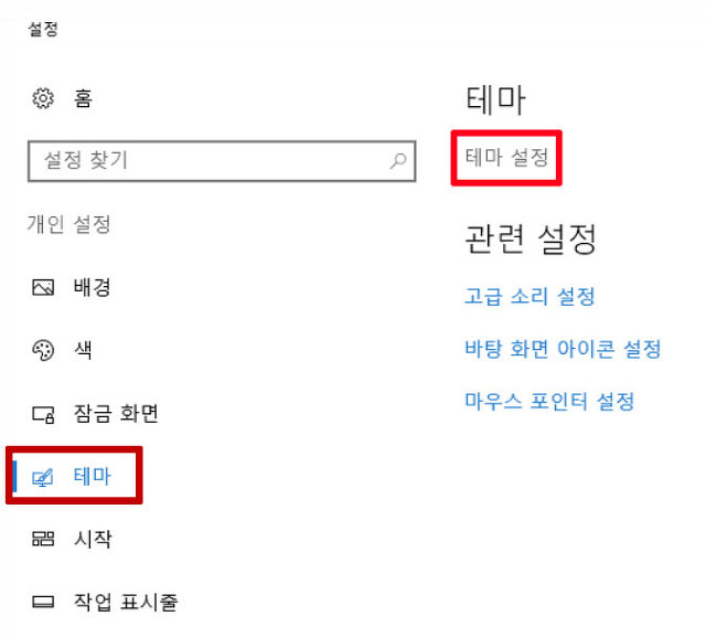 그럼 다음과 같이 설정 창이 뜨면서 테마 항목을 클릭하고 테마 설정 메뉴를 다시 클릭해주시면 됩니다