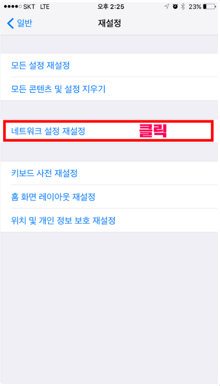 그럼 여기에서도 네트워크 설정 재설정 항목을 찾을 수 있습니다 이 버튼을 눌르면 아이폰 네트워크가 다시 잡히게 되면서 충돌 오류가 해결되오니 이 점 유의하셔서 이용해 보시면 되겠습니다