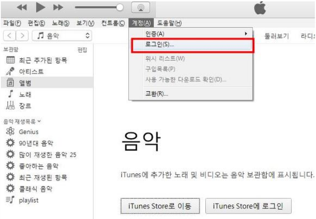 아이튠즈 실행 후 상단을 보시면 위 그림과 같이 계정 메뉴가 보이시죠 이 버튼을 클릭해주세요