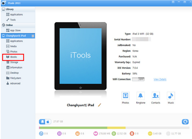 사진이나 문서 , 음악 , 동영상 등 각종 파일을 넣기 위해 좌측 사이드바 메뉴를 선택하셔야 하는데요 만약 pdf 파일을 넣어준다고 하면 사이드바에서 ibooks 버튼을 클릭해줍니다
