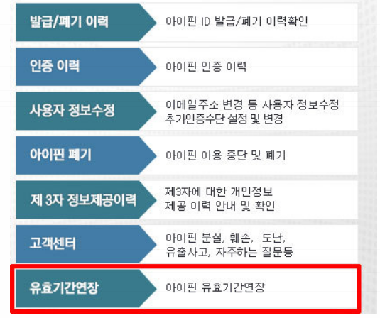 그러면 위 그림과 같이 i pin 아이디와 비밀번호 찾기 및 유효기간 연장 항목이 있는것을 찾아주실 수 있습니다