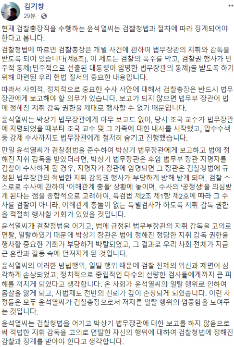 그러면서 “거듭 조국 장관 과 윤석열 총장은 공동운명체로 문재 인 대통령의 검찰개혁을 성공하게 할 책임이 있다”라며 “모든 사실은 밝혀져야 하지만 개혁 을 훼방 해선 안 된 다”라고 했죠...