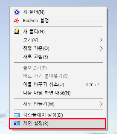 가장 먼저 바탕화면에 마우스 우클릭 하셔서 개인 설정으로 들어가주시면 됩니다