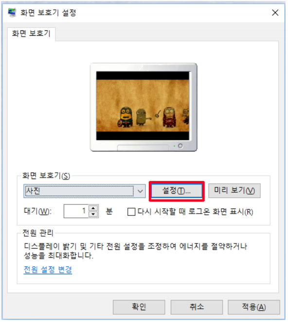 그럼 다음과 같이 화면 보호기 설정 창이 다시 뜨면서 원하시는 화면보호기 테마를 선택해주시고 적용을 누르시면 컴퓨터 화면보호기 설정 이 완료 됩니다