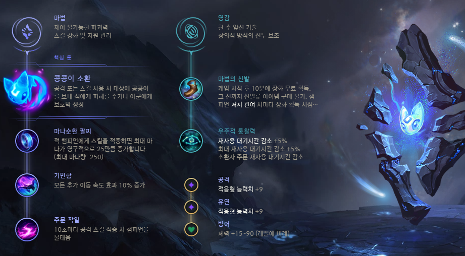 그럼 본격적으로 롤 시즌9 룰루 룬 공략부터 알아보도록 하겠습니다. 룰루는 견제가 좋은 아군을 보호하는 서폿이고, E 스킬로 아군에게 보호막을 제공할 수 있어 시너지가 좋은 콩콩이 소환을 핵심 특성으로 많이 사용하는 것을 볼 수 있습니다. 룰루의 단점이라고 하면 마나 소모가 많아 마나 관리가 힘들다는 점을 들 수 있는데요. 따라서 콩콩이 소환 이하로는 마나순환 팔찌도 사용을 해주시는 게 좋고요.