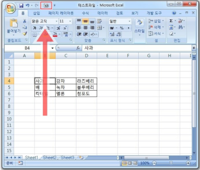 다음 그림과 같이 엑셀 상단을 확인해 보시면 엑셀 카메라기능 아이콘이 추가된 모습을 확인해 주실 수 있습니다