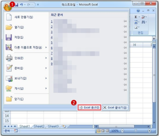 엑셀 프로그램 실행 해주신 다음 먼저 엑셀 카메라기능 아이콘을 꺼내주기 위해서 위 그림과 같이 엑셀 옵션 항목으로 들어가 줍니다
